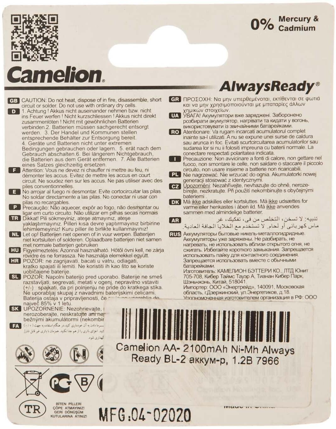 Camelion AA- 2100MAH Ni-mh Always Ready BL-2 (nh-aa2100arbp2, аккумулятор, 1.2В)