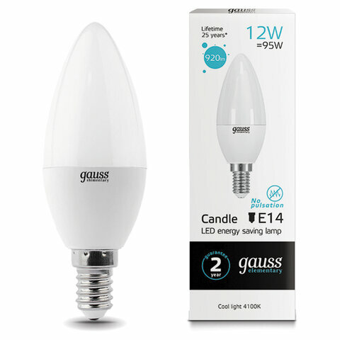 Лампочки Лампа светодиодная GAUSS, 12(95)Вт, цоколь Е14, свеча, нейтральный белый, 25000 ч, LED B37-12W-4100-E14, 33122 (цена за 1 ед.товара)