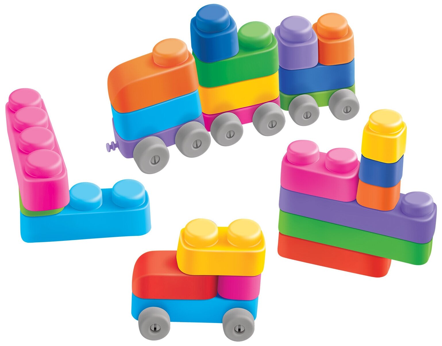 Лучшие цены. Конструктор для маленьких «Мягкие кирпичики» 25 деталей с колёсиками. Состав: одинарный элемент – 7 шт. (ДШВ: 3,7 х 3,7 х 3,7 см), двойной элемент – 7 шт. (ДШВ: 7,7 х 3,7 х 3,7 см), двойной элемент с закруглённым краем – 2 шт. (ДШВ: 7,7 х 3,7 х 3,7 см), тройной элемент – 3 шт. (ДШВ: 11,6 х 3,7 х 3,7 см), четверной элемент – 3 шт. (ДШВ: 16 х 3,7 х 3,7 см), элемент-тележка – 3 шт. (ДШВ: 7,7 х 3,7 х 2,8 см), колёсики – 16 шт. (диаметр – 2,8 см), крепления к колёсикам – 16 шт. Материал: мягкий пластик. Магазины в вашем городе.