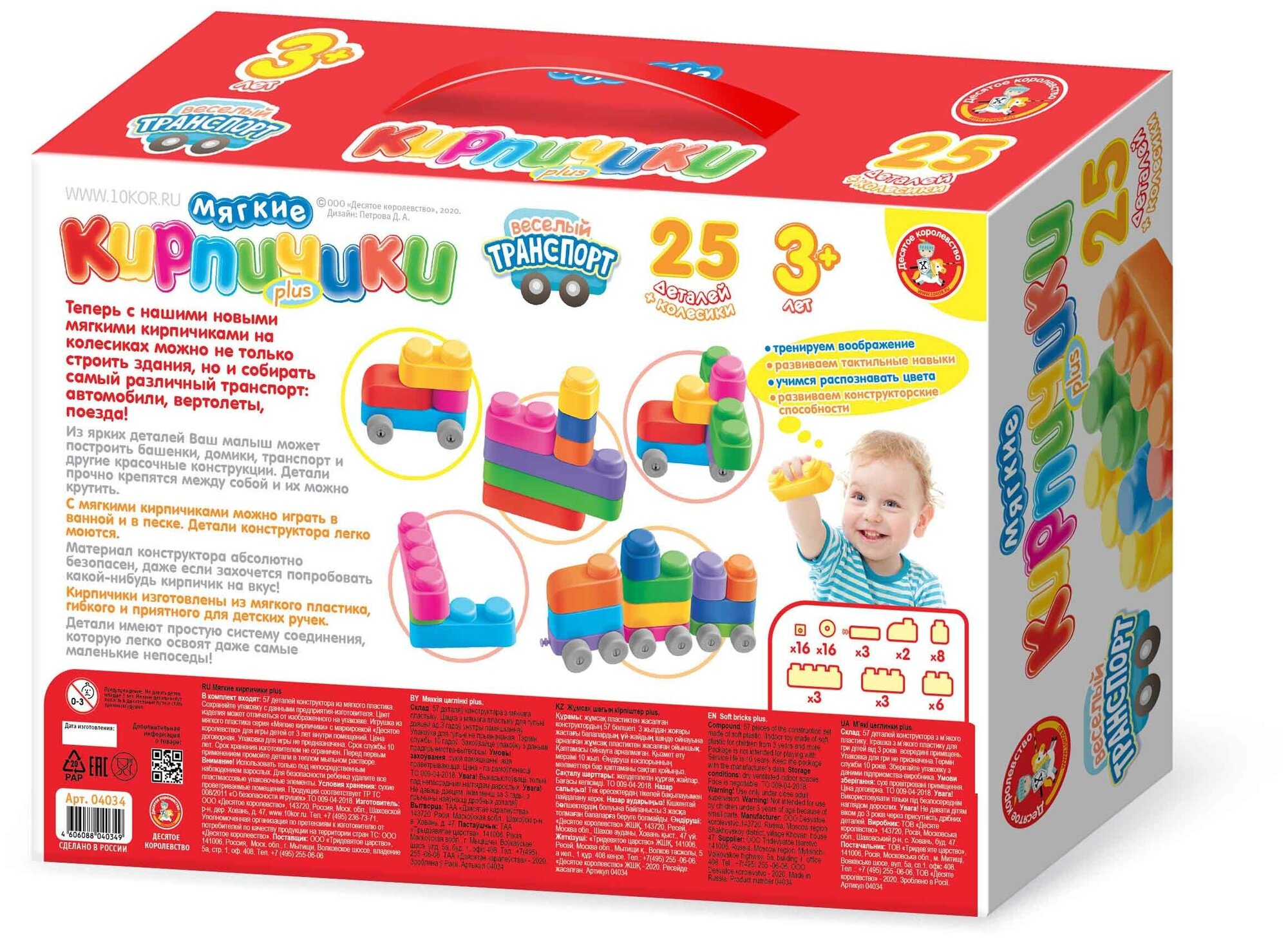 Конструктор Десятое королевство Мягкие кирпичики plus. Веселый транспорт, 25 деталей + колесики, картонная коробка ( Артикул 350165 )