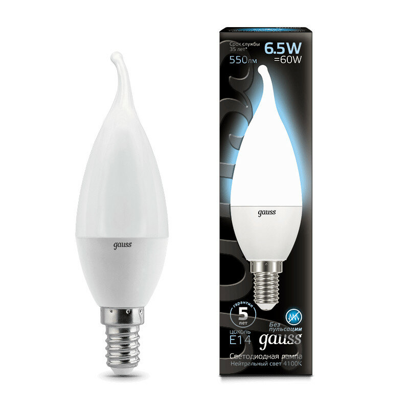 Лучшие цены. Светодиодная лампа Gauss Black имеет оригинальную форму в виде пламени свечи, дрожащего на ветру и выполнена из матового стекла с цоколем E14. Может использоваться в открытых светильниках, подходит для узких плафонов. Отличается малым энергопотреблением — 5 Вт и имеет высокий класс энергоэффективности. Потребляет на 80% меньше электричества, чем лампа накаливания. Лампочка излучает нейтральный свет, соответствующий цветовой температуре 4100К, яркость лампы — 550 Лм. Нейтральный (дневной). Магазины в вашем городе.