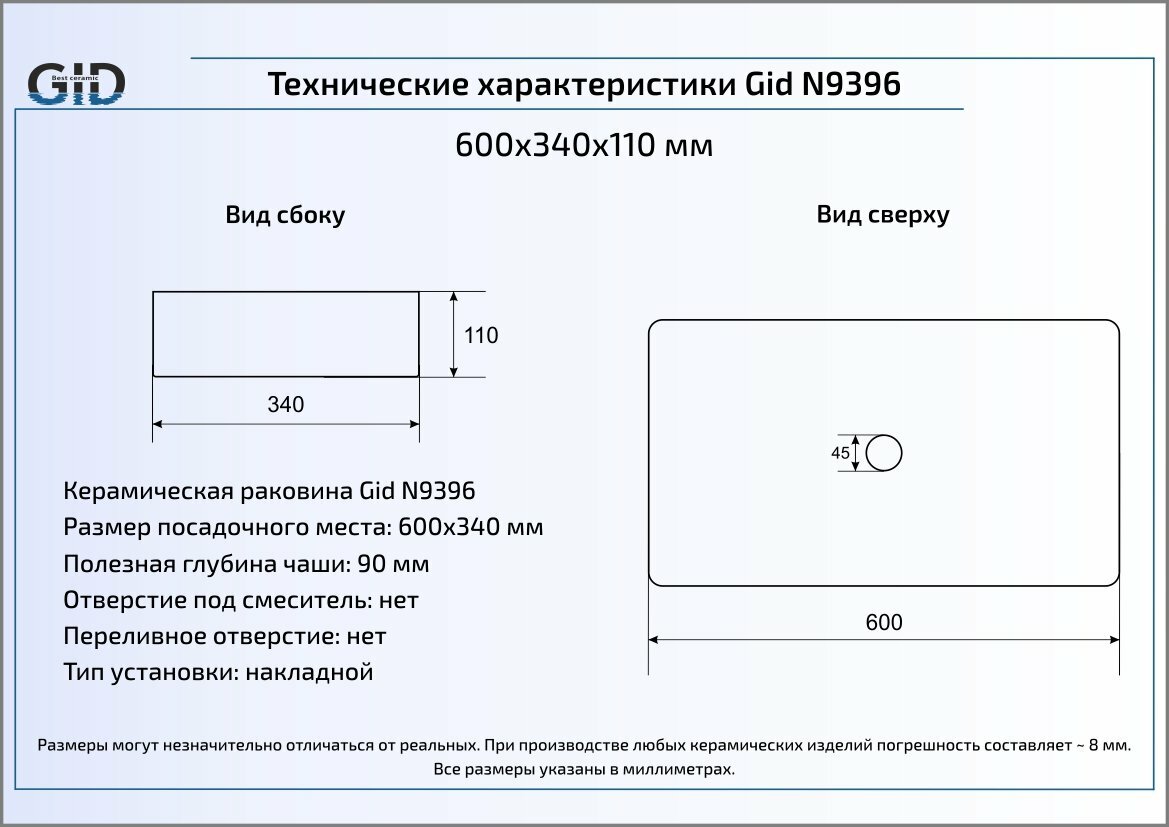 (60х34х11см) Керамическая накладная раковина в ванную Gid N9396