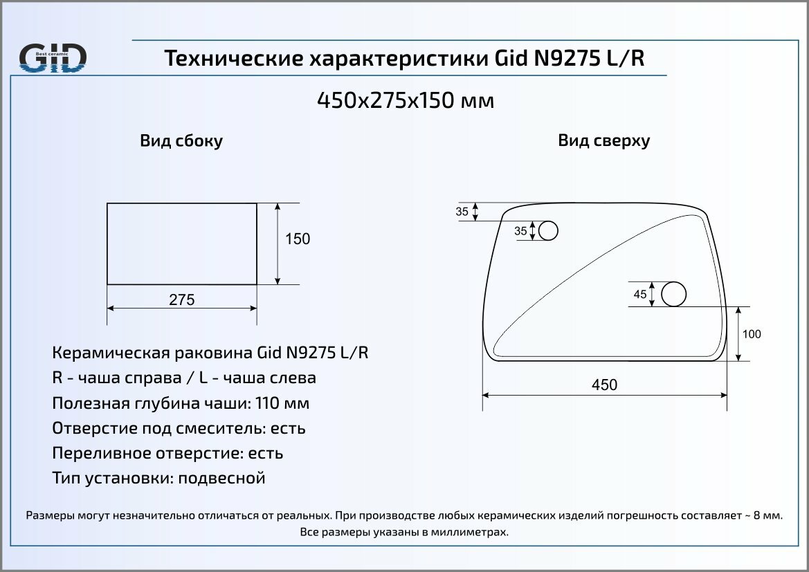 Подвесная раковина правая 45x27.5х15 см, Gid, N9275R