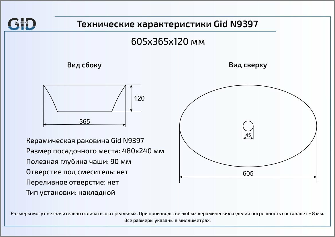 Накладная раковина 60.5x36.5х12 см, Gid, N9397 9 850 ₽ Подробнее
