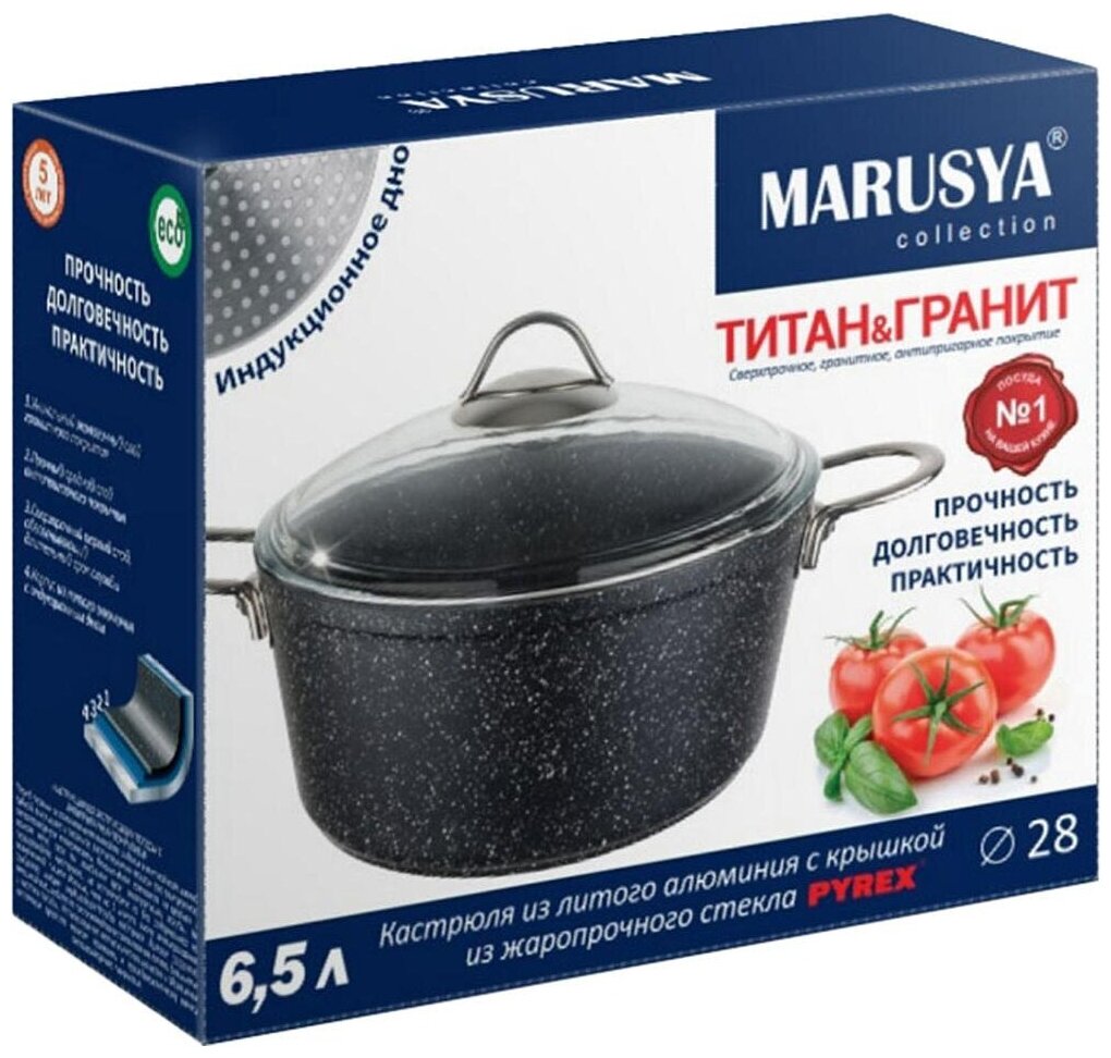 Лучшие цены. Кастрюля Маруся 8001-28к с индукционным дном со стеклянной крышкой, 6,5 л, цвет бронзовый Внутреннее и внешнее сверхпрочное, гранитное, антипригарное покрытие ТИТАН&ГРАНИТ. Покрытие отличается повышенными показателями по износостойкости и увеличенной устойчивостью в случае воздействия острых предметов. При эксплуатации можно пользоваться металлическими предметами (лопатка, вилка, ложка и т. д.) Не царапать и не резать. Магазины в вашем городе.
