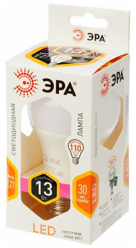 Лампочки Лампа светодиодная Эра 13W E27 2700k тепл.бел. ст.колба LED A60-13W-827-E27, 2 шт
