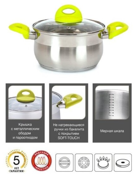 | Дополнительно | совместимость с индукциеймытье в посудомойкеотверстие для парамногослойное дношкала литража |