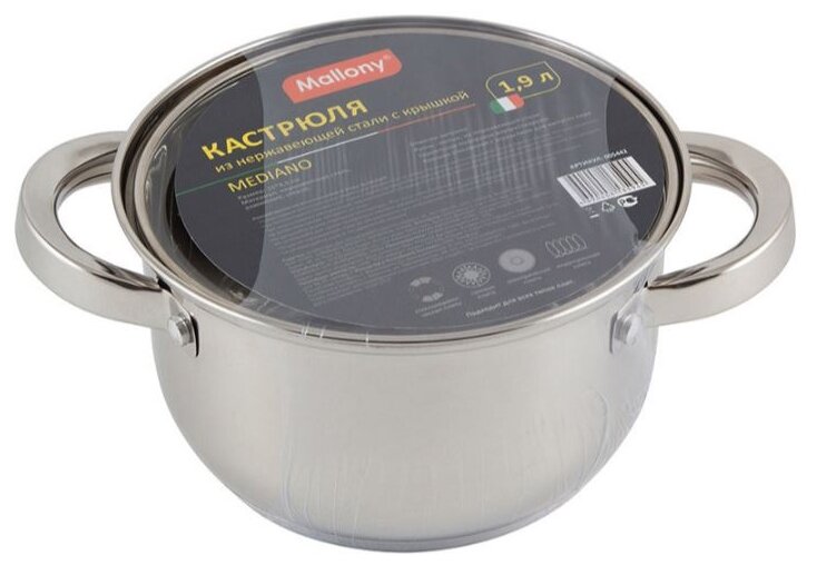 Кастрюля из нержавеющей стали с крышкой Mallony Mediano, 1.9 л, капсулированное дно, подходит для индукции 887 ₽ Подробнее
