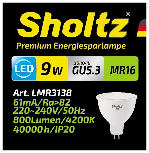 Лампочка Комплект из 5 светодиодных энергосберегающих ламп Sholtz софит MR16 9Вт GU5.3 4000К 220В пластик (Шольц) LMR3138P