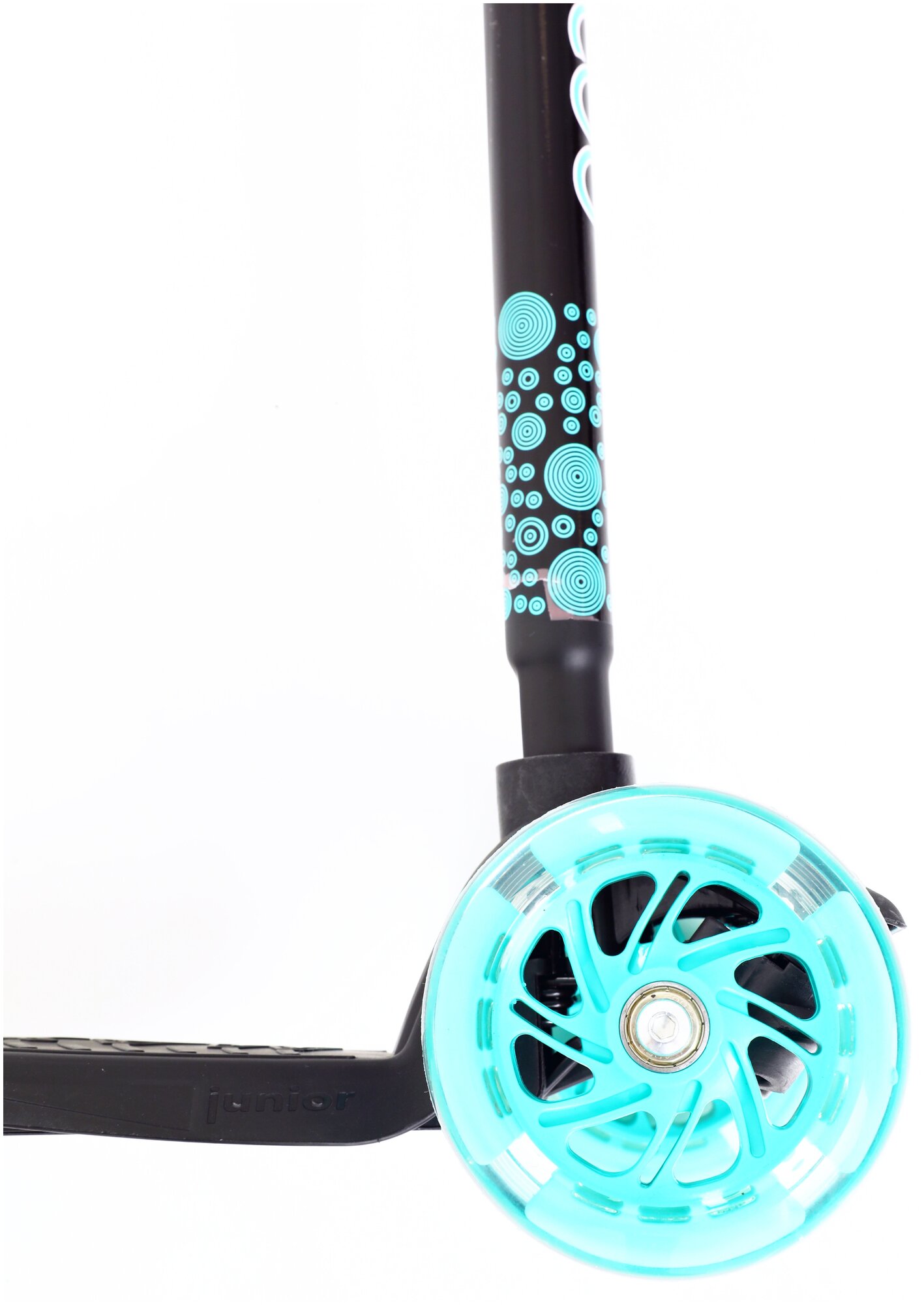 Лучшие цены. Самокат для детей от 3 лет со светящимися передними и двойными задними колесами, рулевая стойка регулируется по высоте и легко снимается с платформы. Характеристики: Материал корпуса: полипропилен, нейлон, алюминий, резина. Материал колес: полиуретан. Способ управления: наклоном. Цвет: черный с бирюзовым. Размер колес: два передних колеса - 120 мм, заднее колесо - 80 мм. Сдвоенное заднее колесо для большей устойчивости. Размер платформы: 33*13 см. Колеса светятся и мигают разными цветами во время движения. Магазины в вашем городе.