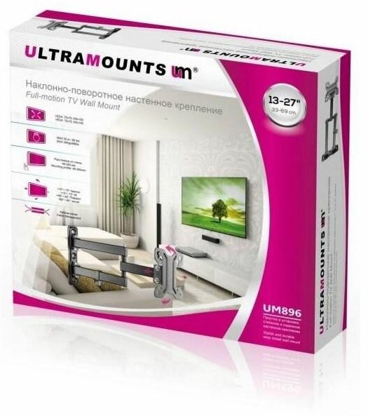 Лучшие цены. Кронштейн для телевизора ULTRAMOUNTS UM 896 создан для малых и средних телевизоров с диагональю 13 - 27 дюймов. Достаточно большая максимальная нагрузка в 30 кг свидетельствует о высококачественных технологиях создания материала и сварки швов. Качественная конструкция позволяет без усилий регулировать положение экрана в трех плоскостях. Наклон осуществляется на +/- 15 градусов, угол поворота на +/- 90 градусов. Расстояние до стены варьируется от 49 мм до 393 мм. Магазины в вашем городе.
