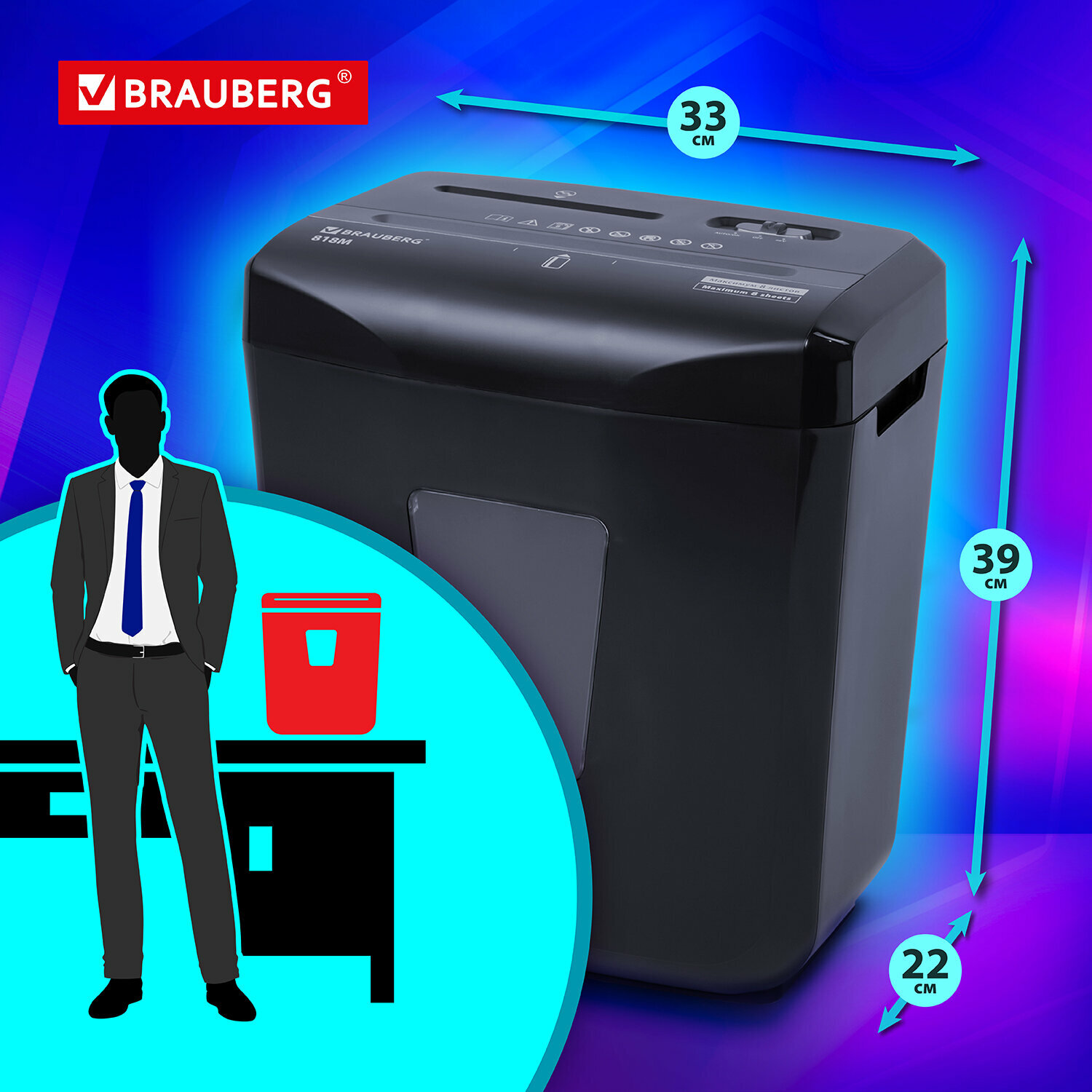 Уничтожитель (шредер) BRAUBERG 818M, 5 уровень секретности, фрагменты 3х10 мм, 8 листов, корзина 18 литров, 532153
