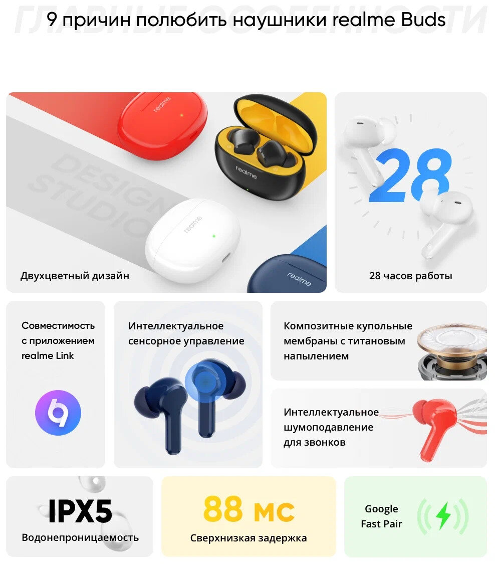 Беспроводные наушники RealMe Buds T100 True Wireless 5.3 Bluetooth 88MS Blue с низкой задержкой, черные 2 990 ₽ Подробнее