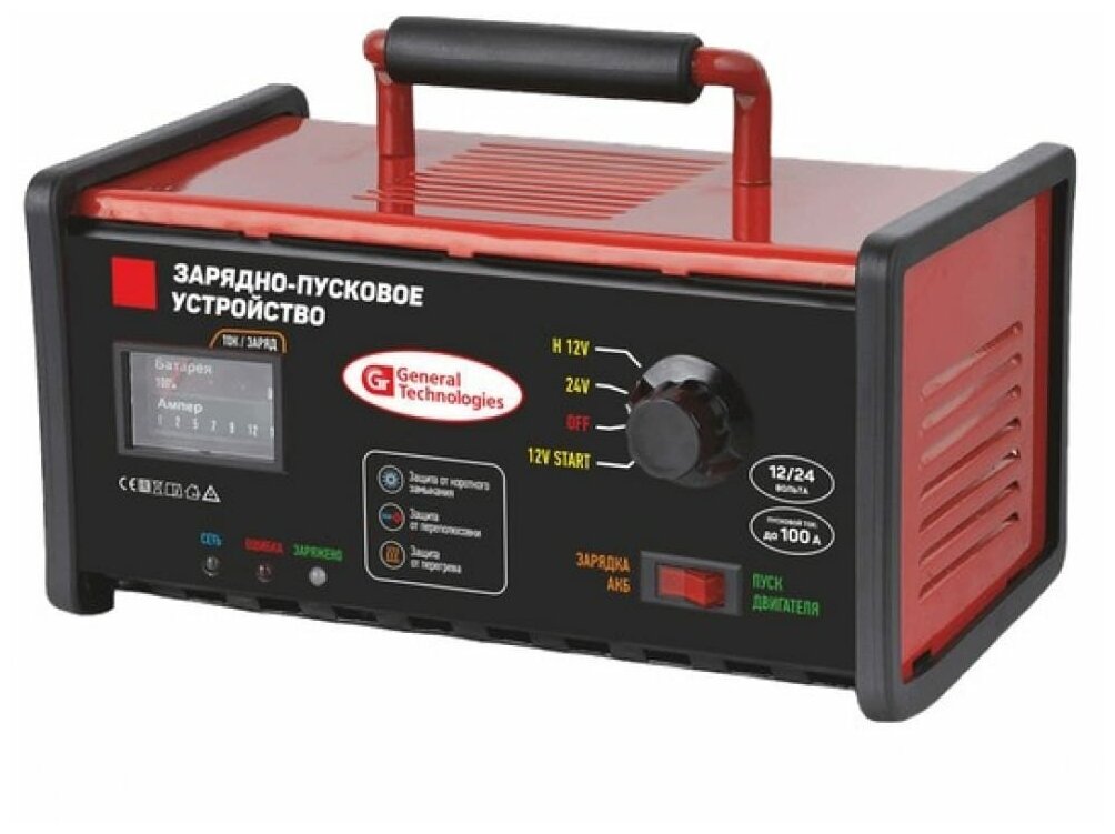 Лучшие цены. Пуско-зарядное устройство General Technologies GT-JC100 трансформаторного типа. Предназначено для заряда свинцово-кислотных, AGM и гелевых АКБ емкостью до 120 А. Автоматическое регулирование зарядного тока. Ток заряда: до 15 А. Ток заряда: постоянный. Магазины в вашем городе.