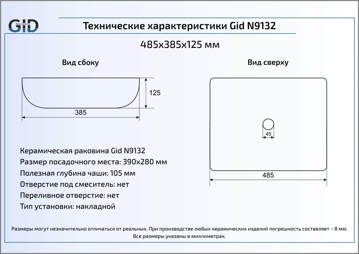 (49х39х12.5см) Керамическая накладная раковина Gid N9132
