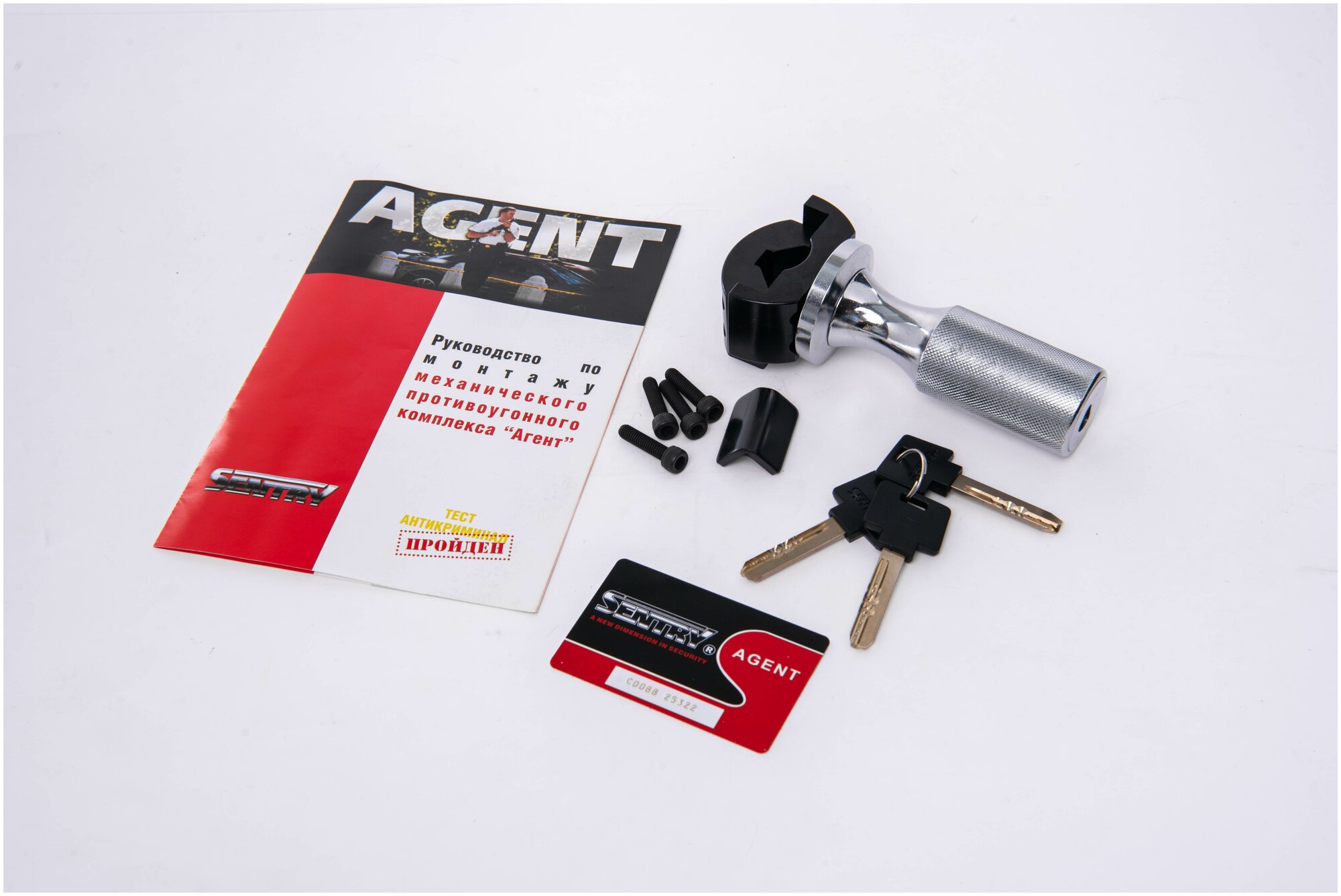 Лучшие цены. Противоугонный блокиратор Sentry Agent - это универсальный противоугонный блокиратор рулевого вала относительно кузова, который может быть установлен на любой автомобиль с открытым участком рулевого вала длиной не менее 35 мм и диаметром 14-28 мм. Блокиратор сделан из высокопрочной стали твердостью 65 HRC, а личинка имеет до 4 000 000 комбинаций ключа и двойной PIN-код. Взломать такой замок и подобрать код практически невозможно. Магазины в вашем городе.