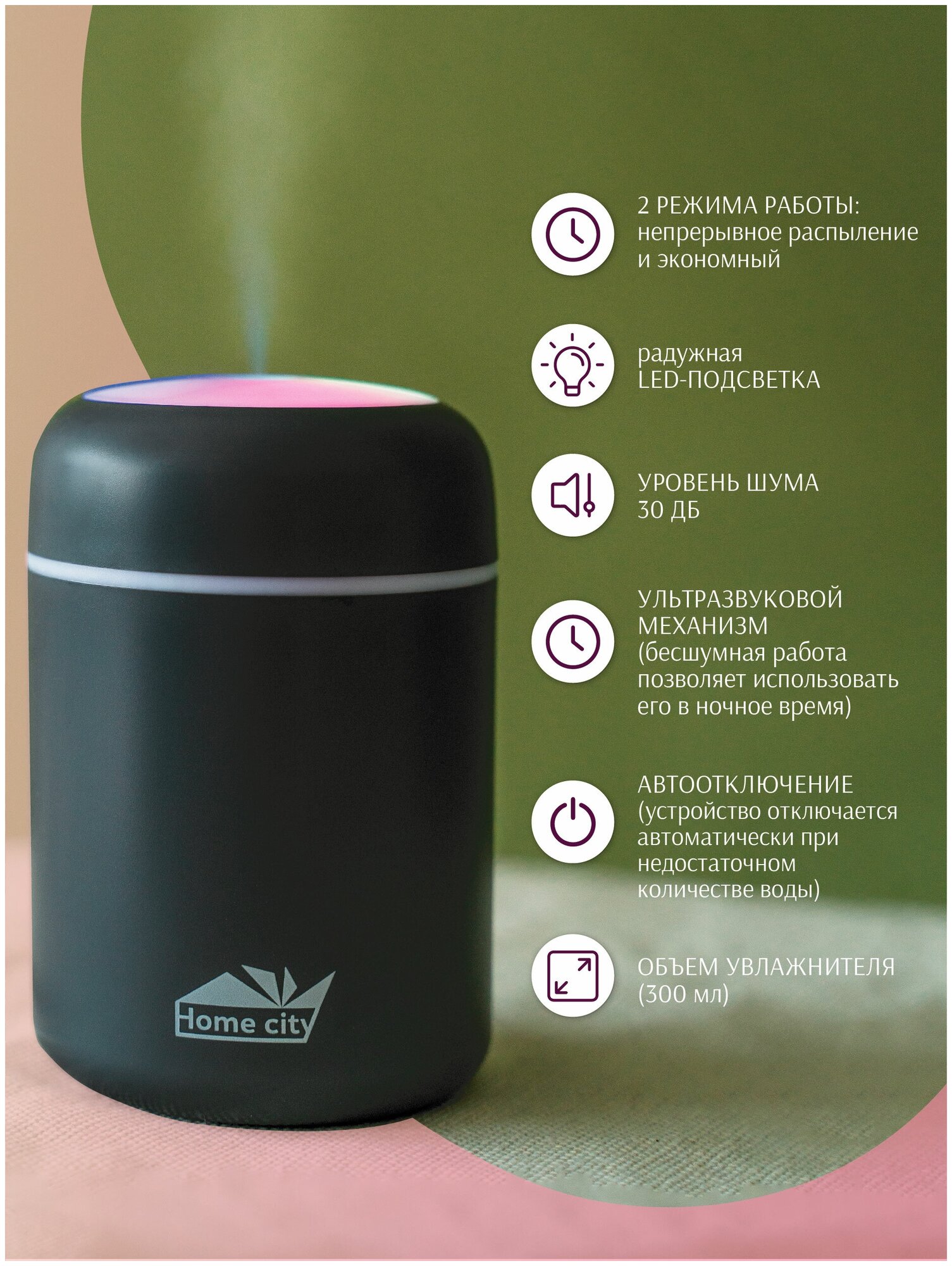 Лучшие цены. Увлажнитель воздуха Home City. Ультразвуковой увлажнитель воздуха - необходимый прибор для создания здорового микроклимата в доме. Ультразвуковые колебания рассеивают воду на мельчайшие частички, которые выходят наружу в виде холодного пара (тумана). Преимущества портативного увлажнителя: бесшумный, простой в использовании, безопасный, экономный расход воды. Воздухоувлажнитель обеспечивает комфортную влажность воздуха в небольшом жилом помещении, препятствует сезонным заболеваниям, облегчает симптомы. Магазины в вашем городе.