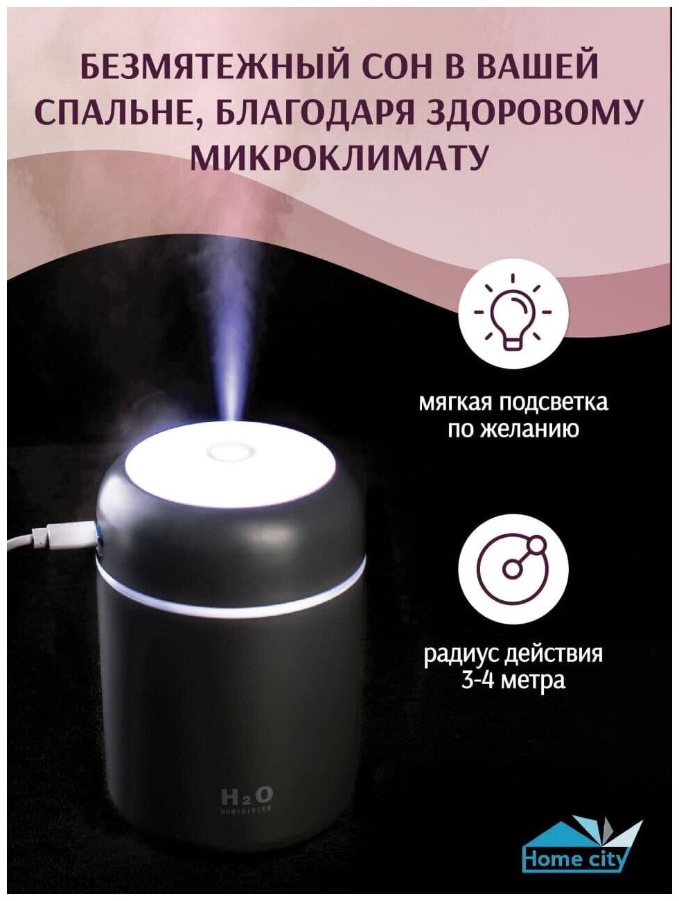 Увлажнители воздуха Портативный увлажнитель воздуха ультразвуковой, воздухоувлажнитель, ночник, с Led-подсветкой для дома, офиса, авто, серый, Home Сity, 300 мл