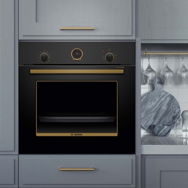 Лучшие цены. Электрический духовой шкаф Bosch NeoKlassik Serie 6 HBJN10YB0R – элегантное решение для классического интерьера. На чёрном матовом фасаде эффектно выделяется фурнитура цвета латуни, ноты ретро привносят круглые аналоговые часы-таймер. У прибора семь режимов работы: различные комбинации верхнего и нижнего нагрева, гриля и конвекции, отвечающей за равномерное распределение горячего воздуха. Вы сможете готовить несколько блюд одновременно: на нижних и на верхних уровнях условия будут одинаковыми. Магазины в вашем городе.