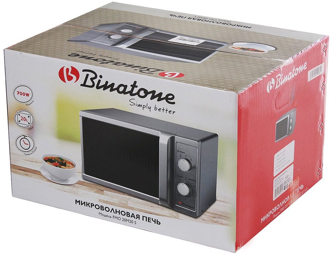 Лучшие цены. Артикул № 719766 Микроволновая печь BINATONE FMO 20M20 S — это простая и надежная техника с приятным современным дизайном. Модель подойдет как для бытового применения, так и для использования в комнате отдыха, отеле, небольшом офисе или загородном доме. Объем камеры составляет 20 литров, что позволяет разогревать еду в больших емкостях или размораживать птицу целиком. Мощность 700 Вт настраивается удобным регулятором, позволяет быстро разогревать пищу и даже готовить несложные блюда. Магазины в вашем городе.
