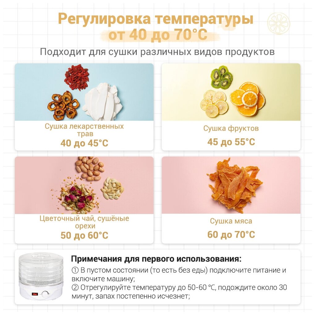 Лучшие цены. Сушилка для фруктов, овощей и мяса Bear BY1142. 1. Удобное кнопочное управление: регулировка температуры 40-70 ℃. 2. Может сушить различные продукты, такие как: сухофрукты, орехи, овощи и мясо. 3. За один раз можно сушить 2 кг мяса (корм для собак среднего размера на 7-10 дней). 4. Циркуляция горячего воздуха с постоянной температурой обеспечивает равномерное и быстрое высыхание продуктов. 5. Высокий уровень энергосбережения, сушилка потребляет около 2 кВт/ч электроэнергии за 8 часов работы. 6. Магазины в вашем городе.