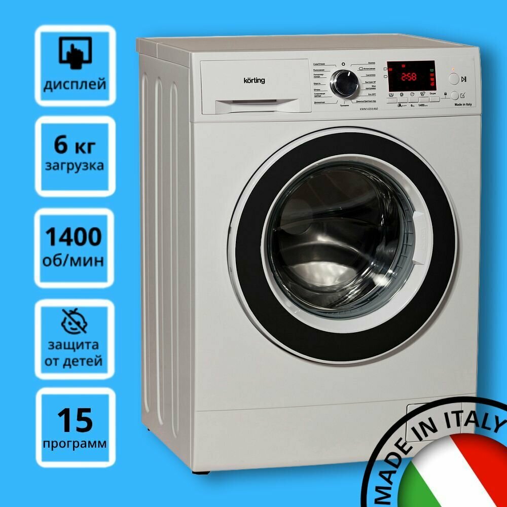 Стиральная машина Korting KWM 42D1460, загрузка 6 кг, 15 программ стирки, 1400 об. мин, дисплей с блокировкой управления, цвет белый 54 990 ₽ Подробнее