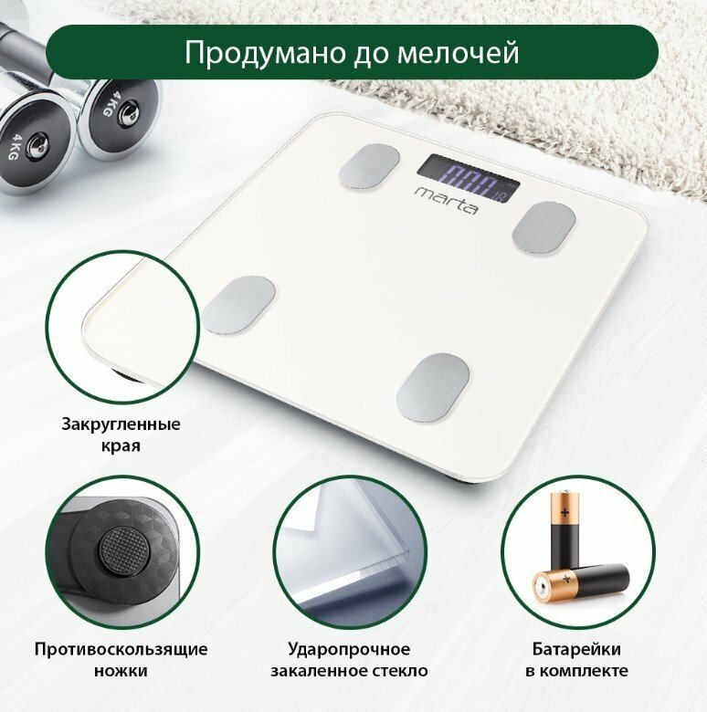 Весы напольные MARTA MT-1683 зеленый нефрит LCD диагностические, умные с Bluetooth