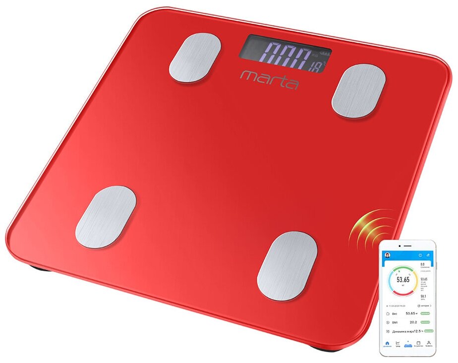 MARTA MT-1683 красный рубин LCD весы напольные диагностические, умные с Bluetooth