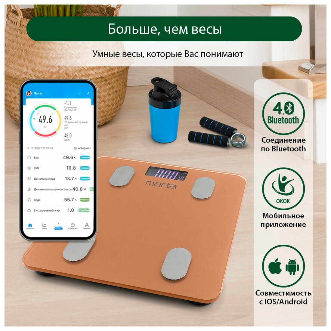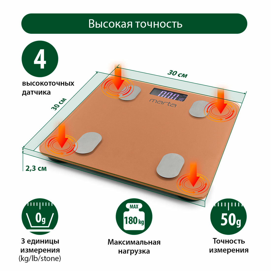 MARTA MT-1607 золотистый опал LCD весы напольные диагностические, умные с Bluetooth