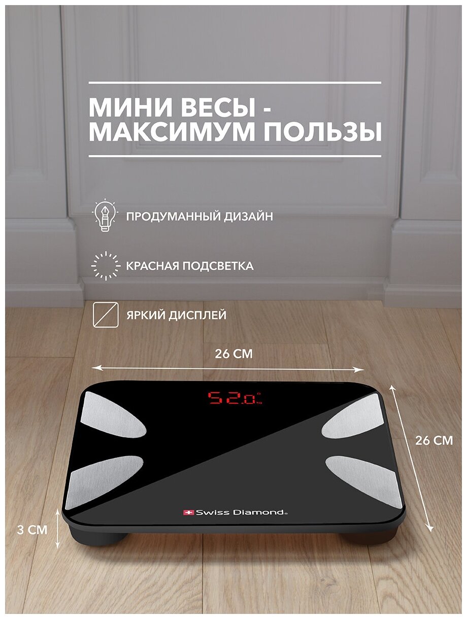 Весы Напольные весы Swiss Diamond SD-SC 003 mini / весы напольные электронные / умные весы / диагностические весы / весы напольные мини, черный