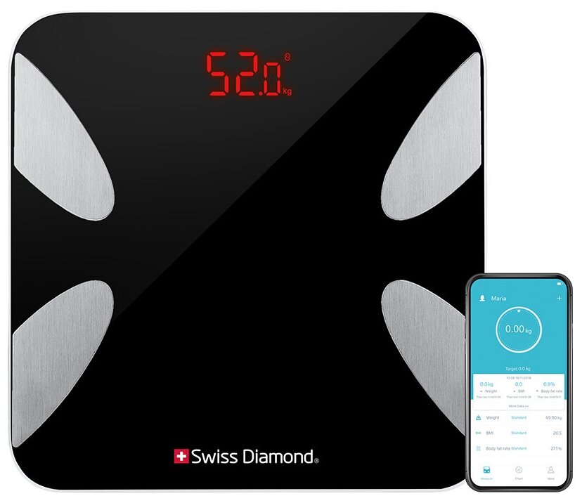 Лучшие цены. Электронные напольные весы SWISS DIAMOND SD-SC 003 mini проводят диагностику состава тела методом BIA. Они оценивают 13 биометрических характеристик: • массу, • ИМТ, • долю жировой ткани, • вес тела без жира, • подкожный жир, • висцеральный жир, • уровень воды в организме, • скелетные мышцы, • мышечную массу, • костную массу, • белок, • скорость метаболизма, • биологический возраст. Предусмотрена функция взвешивания ребёнка. Магазины в вашем городе.