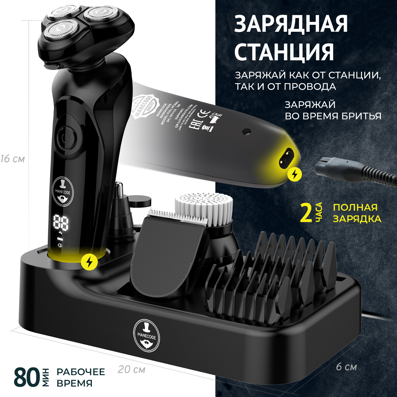 Электробритвы Электробритва мужская Manecode MAVERICK с технологией FLOATING 8 и зарядной станцией - В комплекте триммер для бороды и носа с набором насадок
