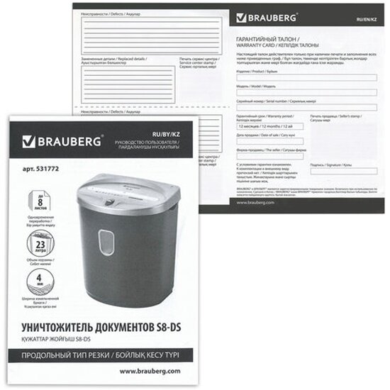Уничтожитель (шредер) BRAUBERG S8-DS, 2 уровень секретности, полоски 4 мм, 8 листов, 23 л, 531772