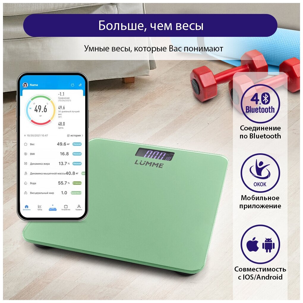 Весы напольные LUMME LU-1335 зеленый нефрит LCD диагностические, умные с Bluetooth