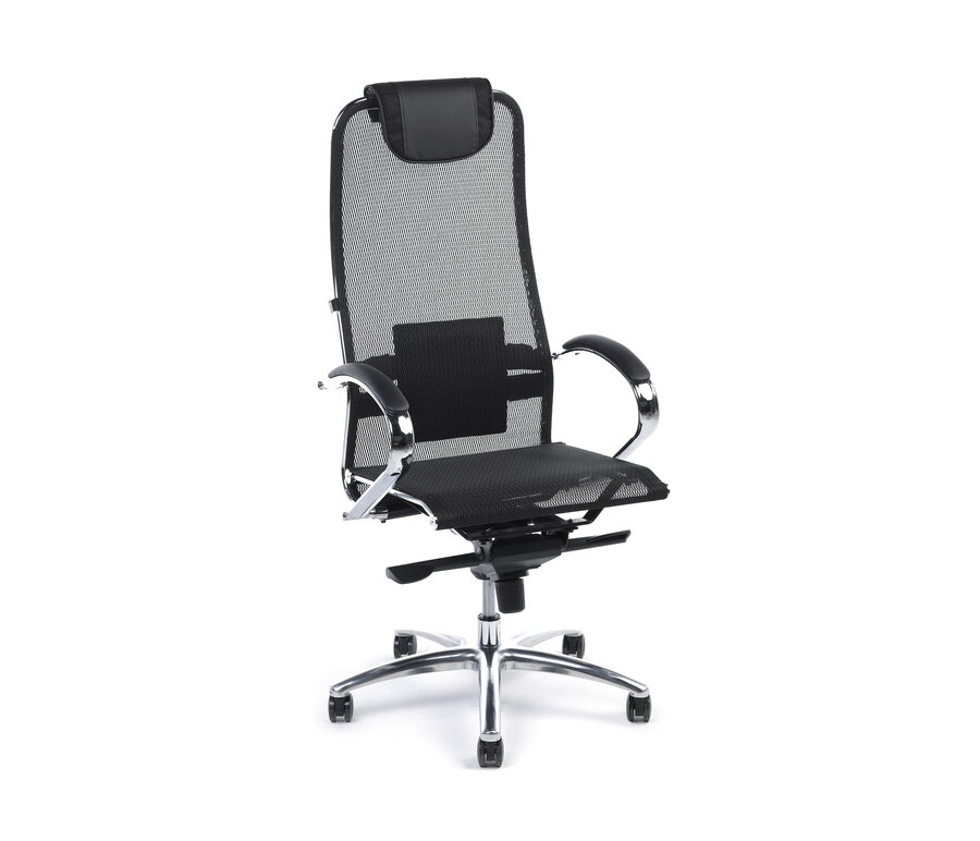 Лучшие цены. Ортопедическое кресло для руководителя Deco черного цвета с алюминиевой крестовиной, обеспечивающей жесткость конструкции. Спинка высокая с системой качания, подголовником и поясничным упором обеспечивает комфорт во время использования. Сиденье и спинка выполнены из прочной сетки. Крестовина алюминиевая. Угол наклона и высота сиденья регулируется. Магазины в вашем городе.