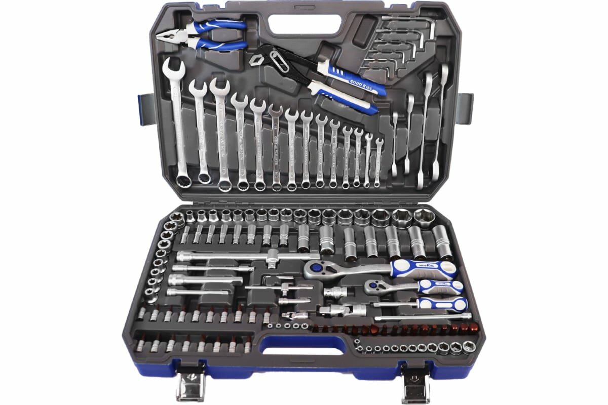 Набор инструментов GOODKING, 150 предметов, трещотка 1/2", 1/4", 3/8", набор ключей, торцевых головок, универсальный (M-10150) 17 260 ₽ Подробнее