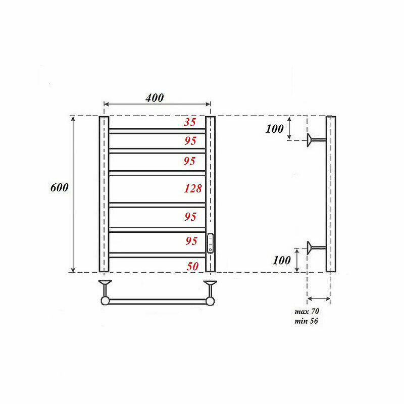 Лучшие цены. Электрический полотенцесушитель Point PN10846 П6 400x600 диммер справа. Характеристики: - Цвет: хром. - Материал: нержавеющая сталь. - Размер (ШхВхГ): 43,2х60х7 см. - Количество перекладин: 6. - Форма: лесенка. - Монтаж: подвесной. - Направление подключения: правое. - Подключение: электропровод с вилкой/скрытое подключение. - Теплоноситель: сухой (нагревательный кабель). - Тепловая мощность: 85 Вт. - Напряжение: 220 В. - Оснащение: электровыключатель, таймер, терморегулятор. Магазины в вашем городе.