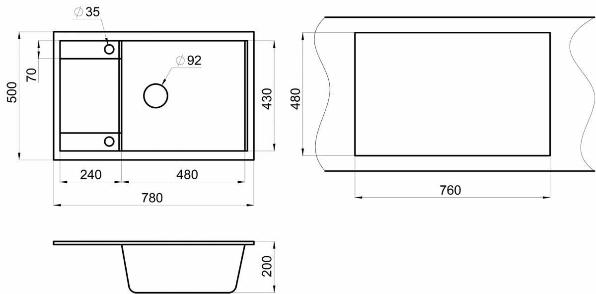 Кухонная мойка кварцевая Granula GR-7805 прямоугольная с крылом, врезная, чаша 480х440, цвет шварц (7805sv)
