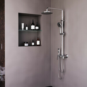 | Комплектация | ручной душ (душевая лейка) / верхний душ (тропический) / смеситель / стойка / штанга / душевой шланг / крепление ручного душа / полка (в виде верхней части смесителя) |