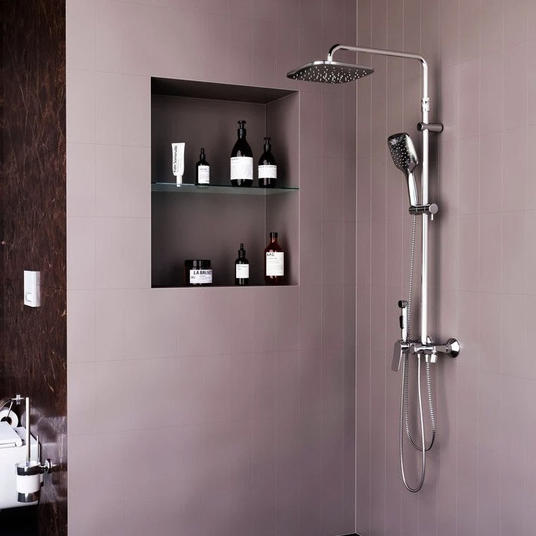 | Комплектация | ручной душ (душевая лейка) / верхний душ (тропический) / смеситель / стойка / штанга / душевой шланг / крепление ручного душа / полка (в виде верхней части смесителя) |