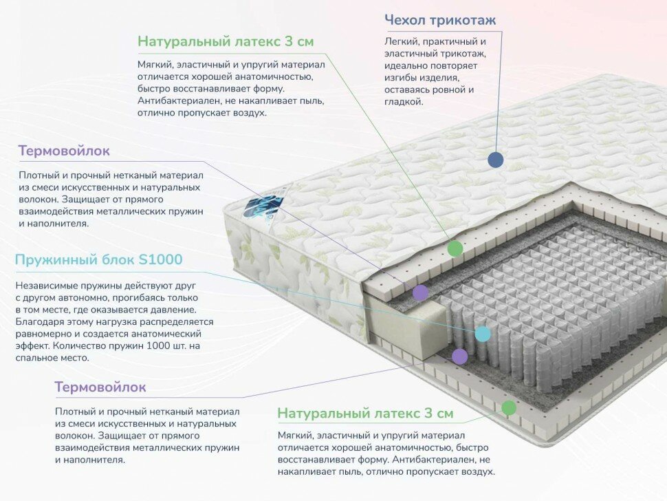 Лучшие цены. Мега Софт - мягкий матрас на независимом пружинном блоке. Основой матраса является блок независимых пружин S1000 состоит из отдельных независимых пружин, заключенных в тканевые чехлы из материала спанбонд. Такой пружинный блок равномерно распределяет нагрузку по всей горизонтальной поверхности матраса, снимает мышечное напряжение и гарантирует комфортный отдых. Комфортный слой представлен натуральным латексом. Это экологически чистый и безопасный материал на основе сока каучукового дерева гевеи. Магазины в вашем городе.