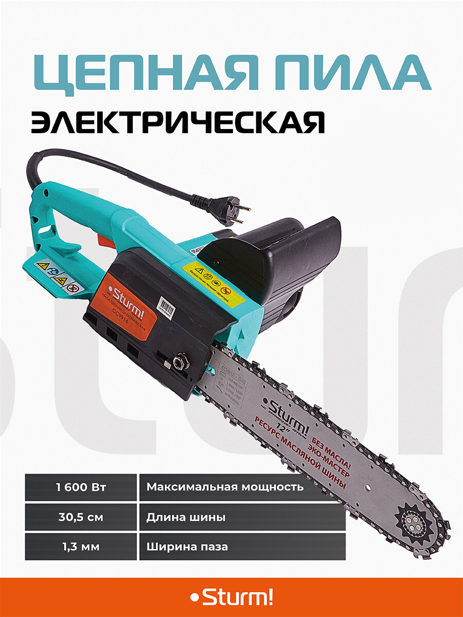Пила электрическая цепная STURM CC9916 безмасляная, 1.6кВт, шина 12" (305мм), шаг цепи 3/8"