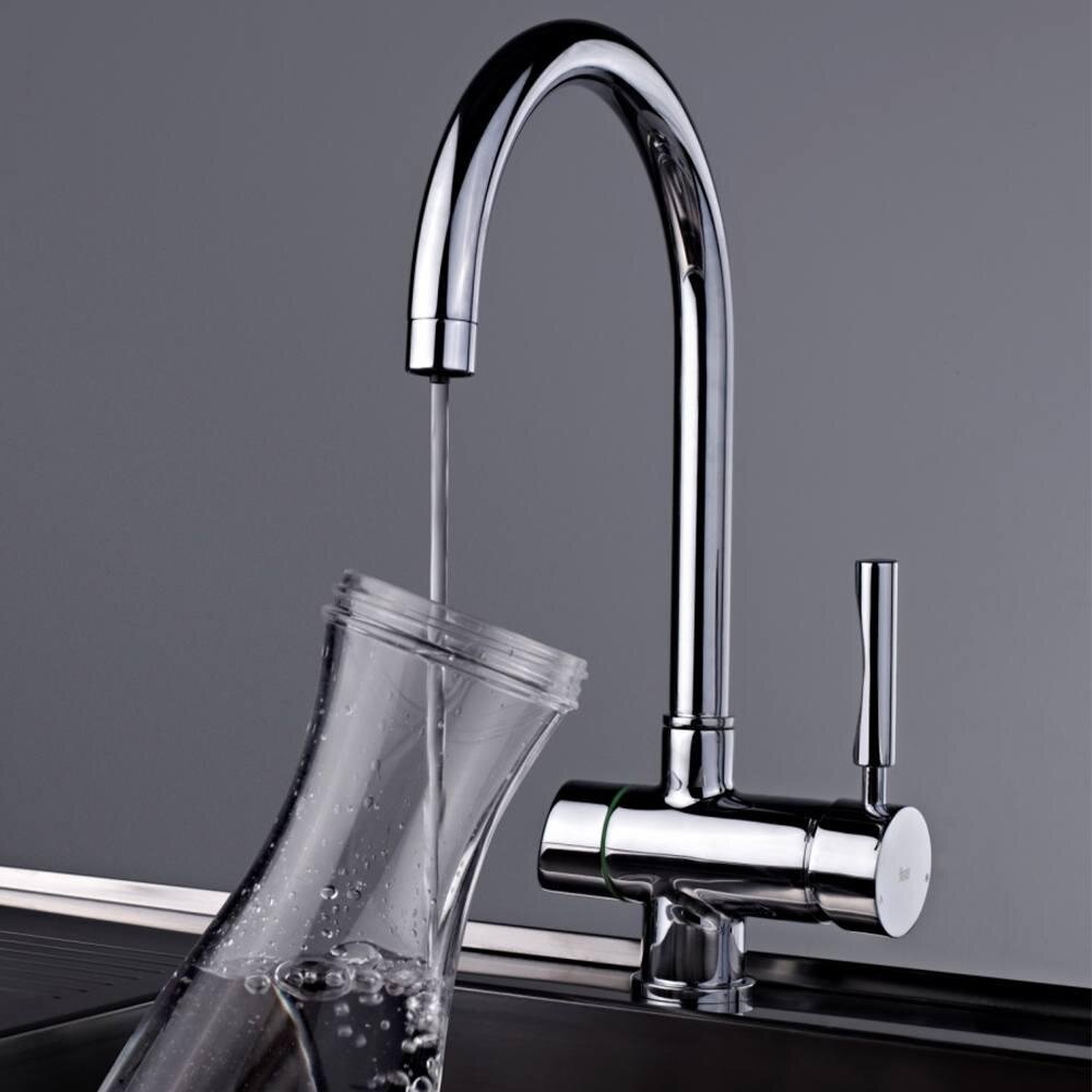 Лучшие цены. Смеситель с функцией фильтраДва независимых водных каналаЛевый регулятор для фильтрованной водыПравый регулятор для нефильтрованной водыПоворотный изливПротивонакипной аэраторГибкие подводящие трубки в стальной оплёткеСистема водосбереженияКартридж 40 ммРадиус 212 ммВысота 368 ммСмеситель изготовлен из латуни. Магазины в вашем городе.