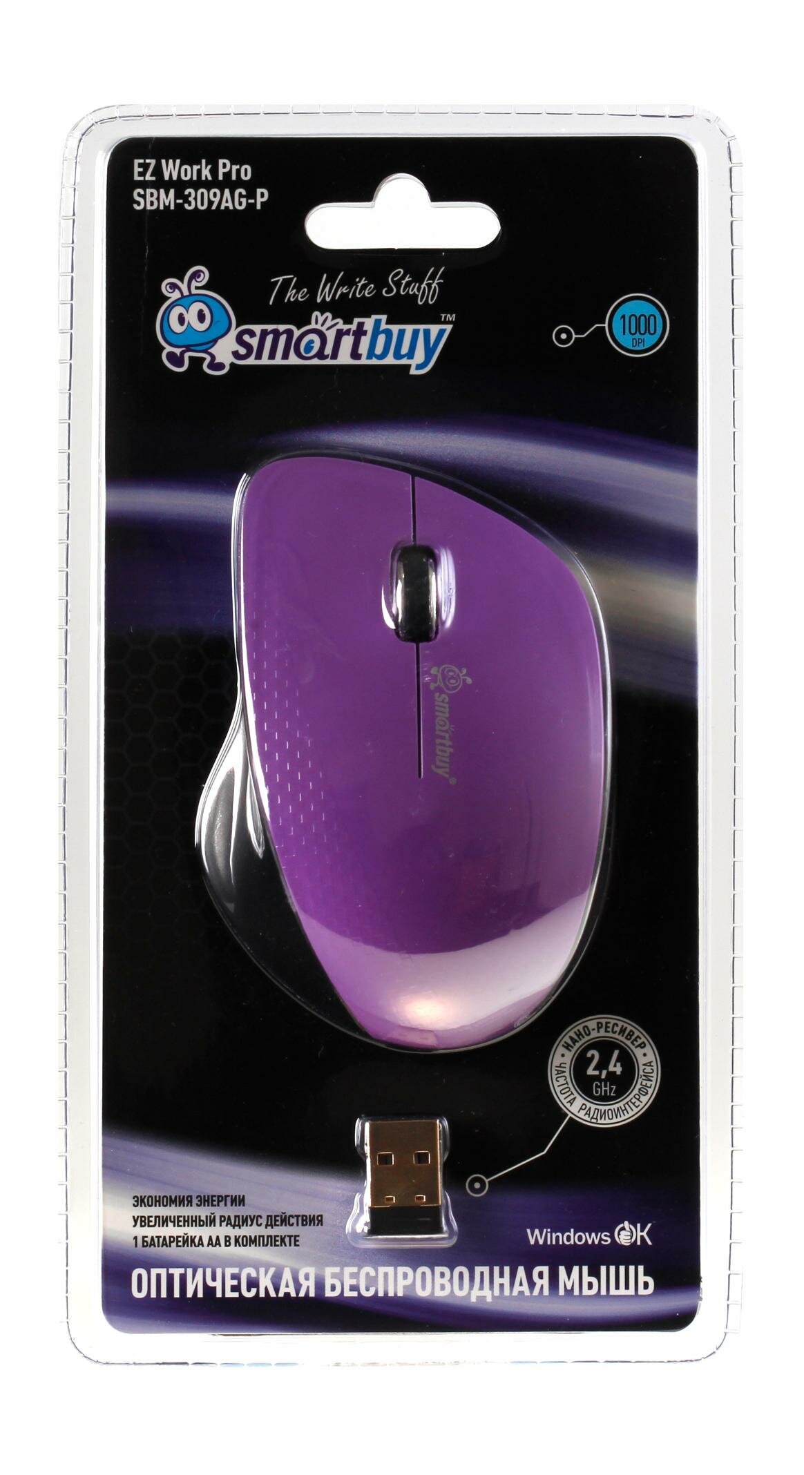 Мышь беспроводная Smartbuy 309AG USB/DPI 1000/3 кнопки/1AA фиолет/черный (SBM-309AG-P)