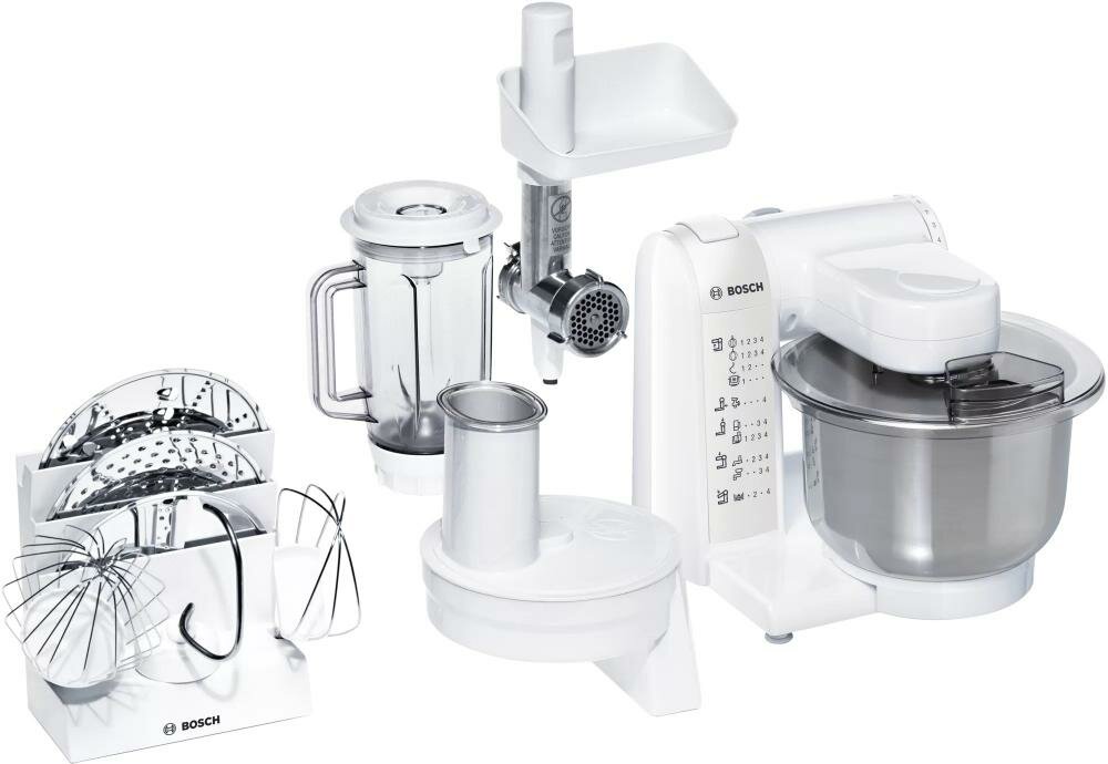 | Аксессуары | венчик для взбивания / насадка / крюк для замеса теста / лопатка для перемешивания (биттер) / 3 диска для фарша / насадка для кеббе / насадка для домашних колбас / 4 насадки для нарезки/шинковки |