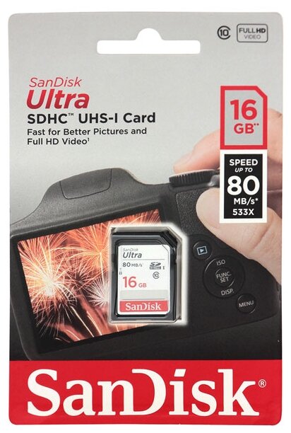 Карта памяти SanDisk SDHC Ultra Class 10 UHS-I U1 (80/10MB/s) 16GB