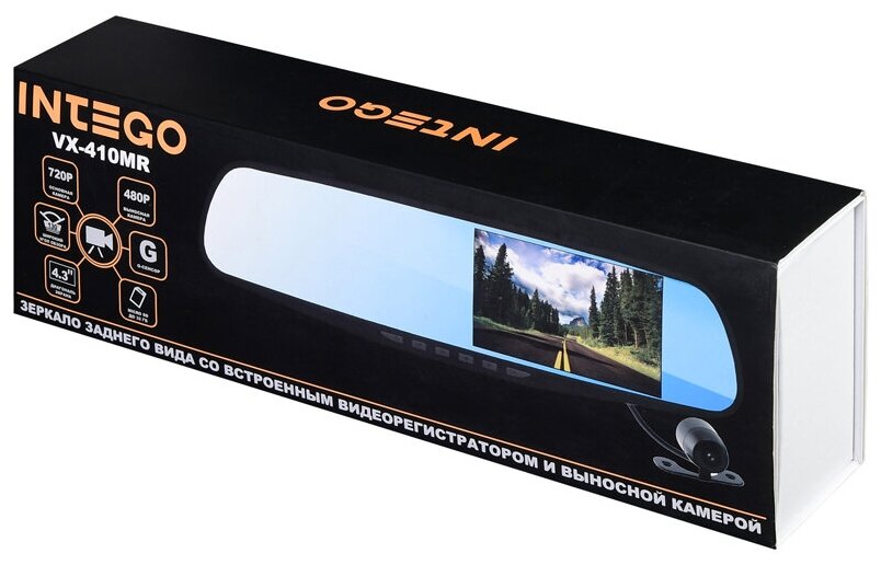 Лучшие цены. Основная камера видеорегистратора INTEGO VX-410MR способна записывать видео в HD качестве, дополнительная камера имеет разрешение VGA (640*480). Видеорегистраторы данного типа очень удобны в использовании, они не занимают много места, не перегораживают обзор водителя, и очень просты в установке. Также такой тип видеорегистраторов прекрасно справляется с функциями стандартного салонного зеркала. VX-410MR имеет большой и красочный встроенный экран диагональю 4.3", с функциональными кнопками под ним. Магазины в вашем городе.