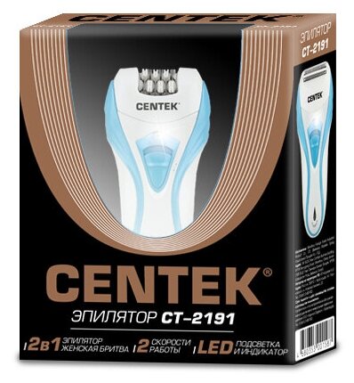 Лучшие цены. Эпилятор Centek CT-2191 обладает удобной эргономичной формой, чтобы вы могли с комфортом использовать его, удаляя волоски или подбривая, поскольку устройством предусмотрены как эпиляционная головка, так и насадка для бритья. За качество результата отвечают 18 пинцетов, 2 скорости работы. А для ювелирной точности работы можете использовать подсветку. Centek CT-2191 допускает возможность промывки его вод водой, а для удаления мельчайших волосков есть щеточка. Магазины в вашем городе.