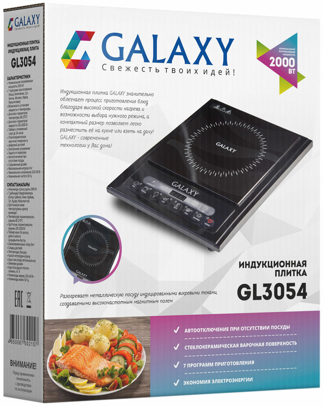Лучшие цены. Настольная индукционная плита GALAXY GL3054 нагревает посуду (кастрюлю, сковороду), а не поверхность плиты. Работа индукционных плит основана на принципе использования энергия электромагнитного поля. Нагрев происходит очень быстро, вода закипает практически мгновенно. При снятии посуды плита отключается. Это позволяет экономить время приготовления пищи, электроэнергию, снижает расходы на кондиционирование помещения. Магазины в вашем городе.