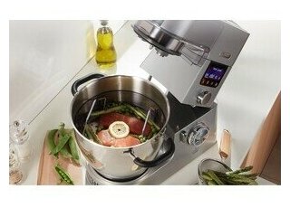 Лучшие цены. Прибор, представляющий флагманскую линейку кухонных машин британского бренда Kenwood, позволяет не только измельчать или смешивать продукты, но и сразу готовить их в той же металлической чаше, рассчитанной на 6.7 литра. Для этих целей модель предусматривает нагреватель с термостатом, электронную систему управления с информативным дисплеем, таймером и 24 автоматическими программами. Для последних задается нужная температура термической обработки. Магазины в вашем городе.
